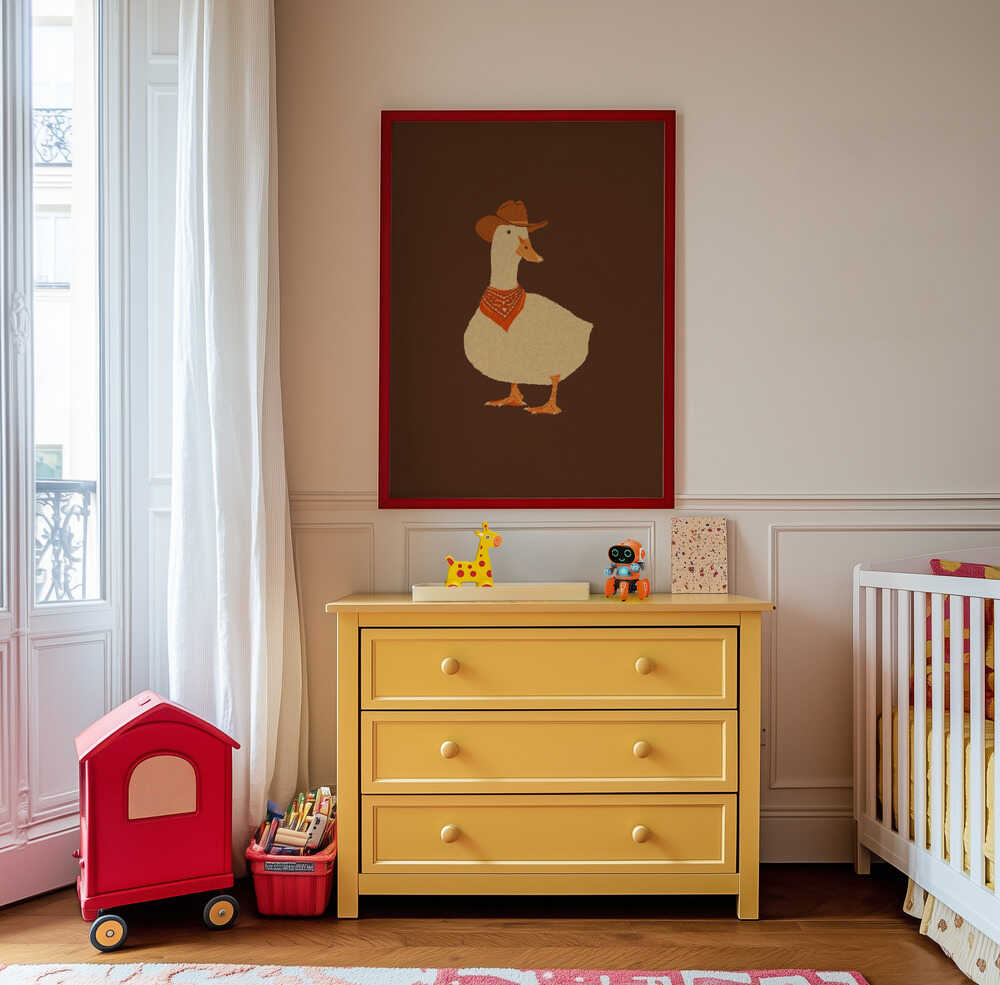 Tilføj et finurligt strejf af charme til din indretning med denne fortryllende vægkunst, der viser Bo the Cowboy Duck klædt i varme jordtoner med sin karakteristiske hat og bandana mod en dyb brun baggrund. Det minimalistiske design og den afbalancerede farvepalet skaber en rolig atmosfære uden at dominere rummet. Designet til at føles både tidløst og legende passer det perfekt over tremmesengen, læsehjørnet eller skrivebordet. Et charmerende valg til børneværelset, legerummet eller den moderne familiebolig – og passer naturligt sammen med skandinavisk indretning og gallerivægge. Trykt på mat museumskvalitetspapir, der bevarer alle fine detaljer og farver i mange år.