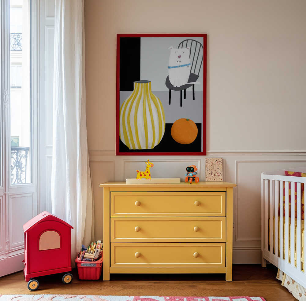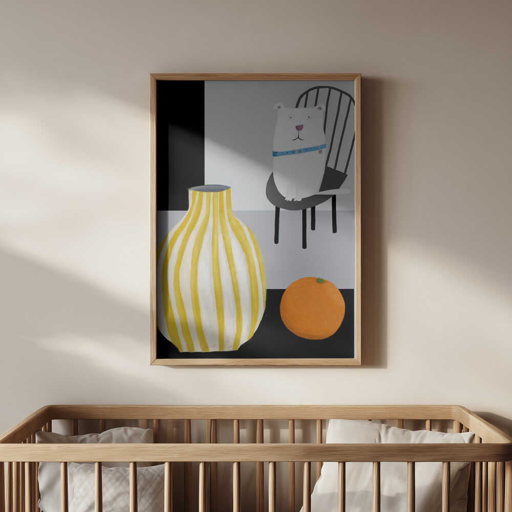 Tilføj et legende strejf af moderne charme til din indretning med denne charmerende vægkunst, der viser en hvid hund på en stol ved siden af en stribet gul vase og en lys orange frugt mod en grafisk, geometrisk baggrund. Det minimalistiske design og den afbalancerede farvepalet skaber en rolig atmosfære uden at dominere rummet. Designet til at føles både tidløst og legende passer det perfekt over tremmesengen, læsehjørnet eller skrivebordet. Et sjovt og stilfuldt valg til børneværelset, legerummet eller den moderne familiebolig – og passer naturligt sammen med skandinavisk indretning og gallerivægge. Trykt på mat museumskvalitetspapir, der bevarer alle fine detaljer og farver i mange år.