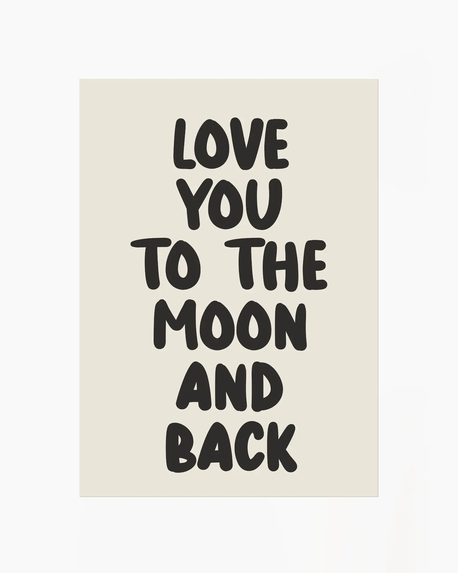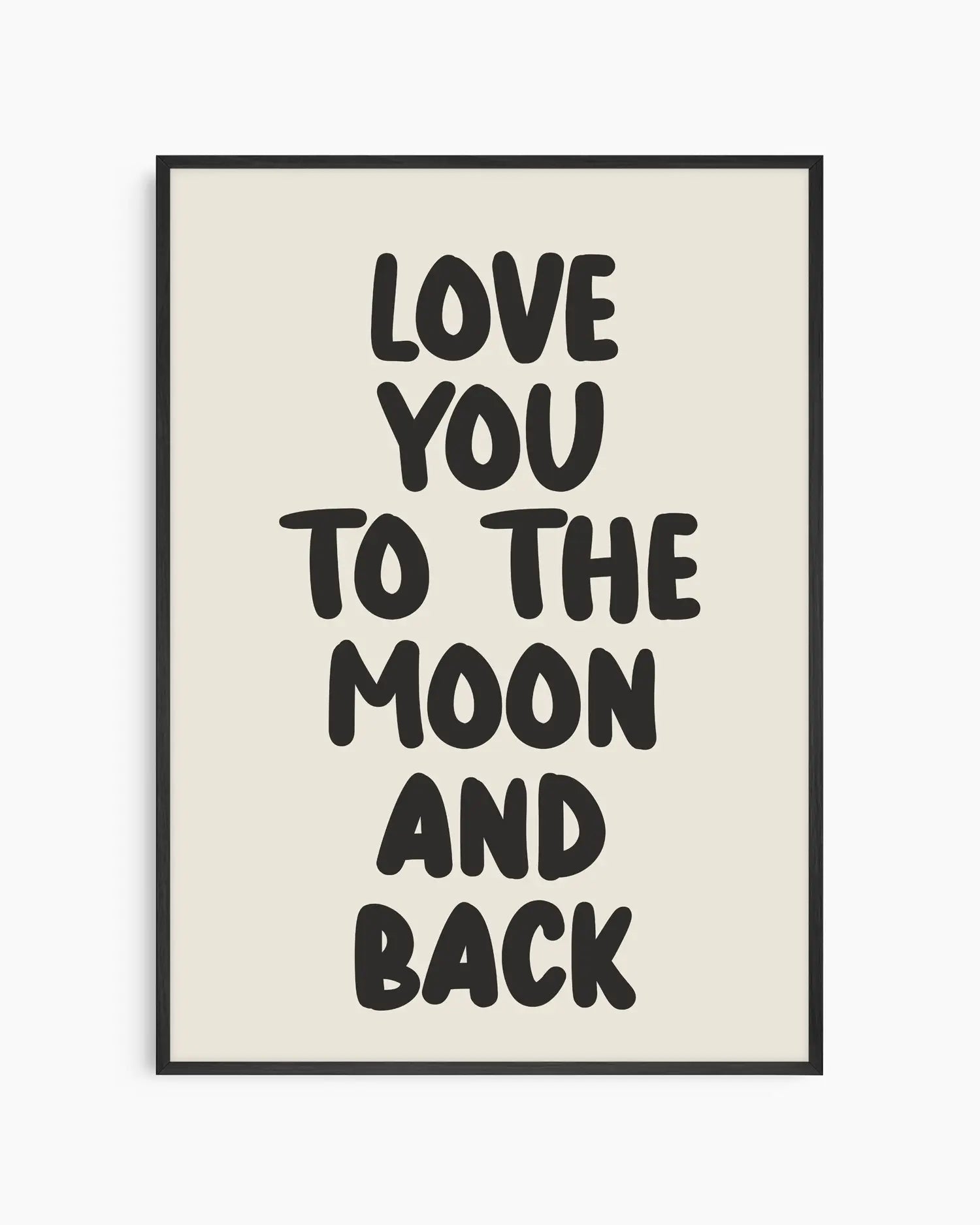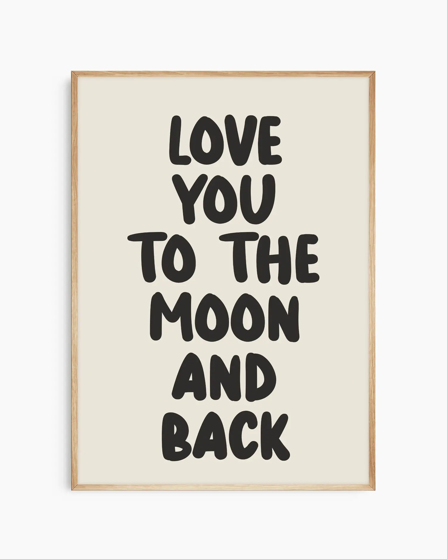 Fejr den uendelige kærlighed mellem dig og din lille med dette tidløse vægprint med det elskede citat “Love You to the Moon and Back.” En sød og hjertelig påmindelse om, hvor stor kærlighed virkelig kan være — perfekt til børneværelser, legeområder og hyggelige familierum.