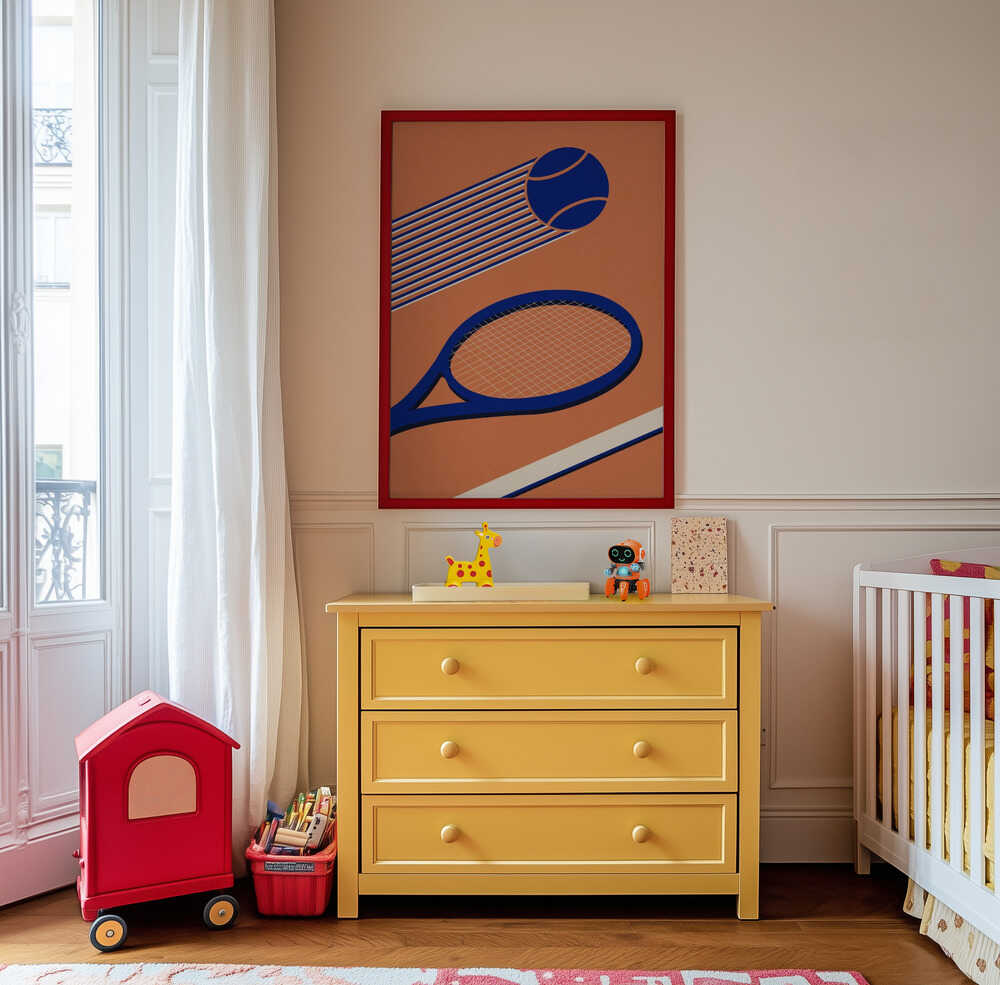 Tilføj et sporty strejf af energi til dit hjem med denne moderne vægkunst i dybe marineblå og varme lerfarver, der viser en minimalistisk tennisketcher og bold i bevægelse. Det enkle design og den harmoniske farvepalet skaber en rolig atmosfære uden at dominere rummet. Designet til at føles både tidløst og legende passer det perfekt over tremmesengen, læsehjørnet eller skrivebordet. Et ideelt valg til børneværelset, legerummet eller den moderne familiebolig – og harmonerer smukt med skandinavisk indretning og gallerivægge. Trykt på mat museumskvalitetspapir, der bevarer alle fine detaljer og farver i mange år.