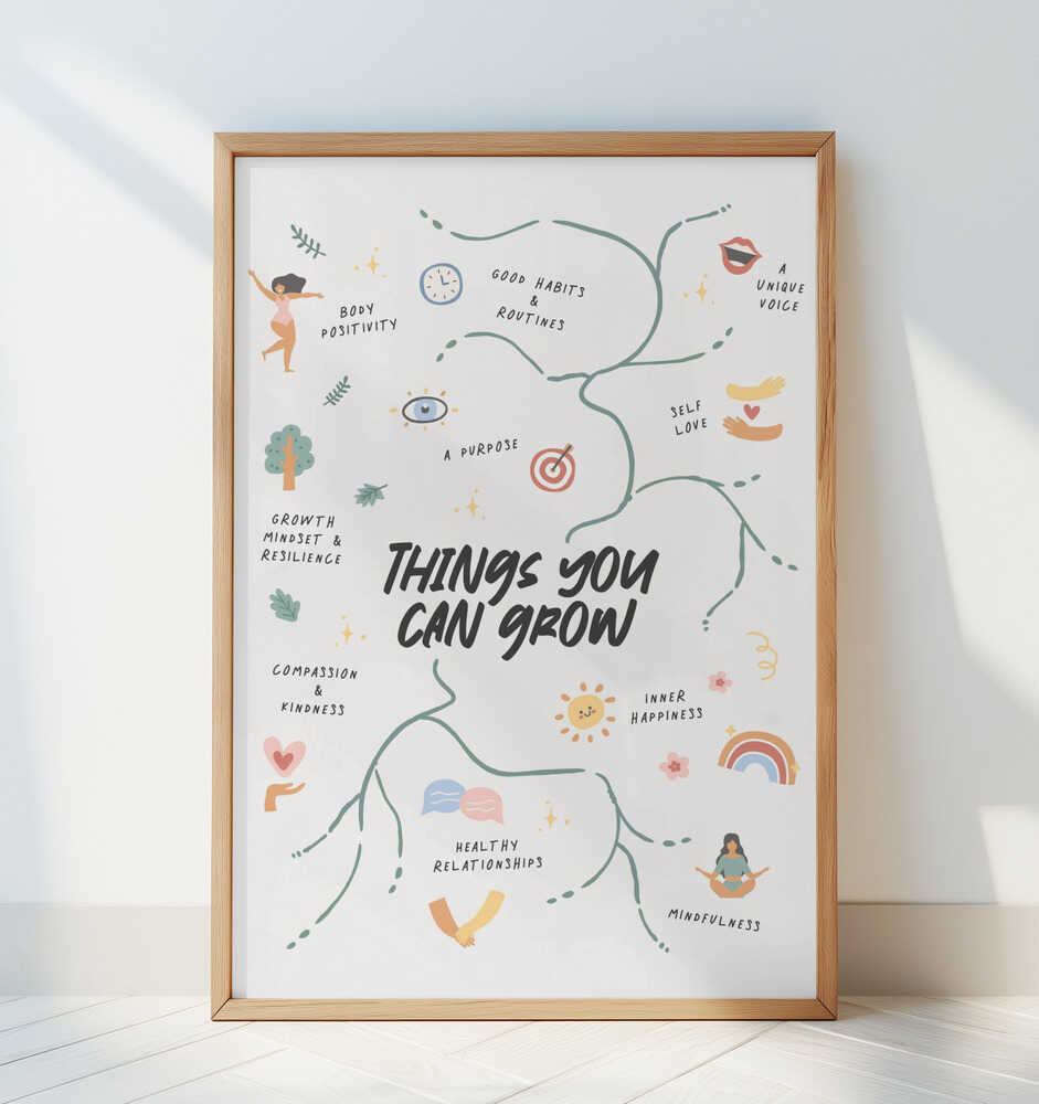 Gør din dag lysere og find inspiration til personlig vækst med denne legende og betænksomme plakat, der minder dig om alle de smukke ting, du kan dyrke i dig selv. Fra selvtillid og tålmodighed til kærlighed, glæde og egenomsorg – hvert illustreret element bringer varme og positivitet til dit rum. De bløde pastelfarver og håndtegnede ikoner skaber et roligt, men opløftende udtryk, der passer perfekt i soveværelser, hjemmekontorer eller kreative hjørner. En vidunderlig daglig påmindelse om, at vækst kommer i mange former. Trykt på papir i museumskvalitet med mat finish, der bevarer sin charme og sit budskab i mange år.