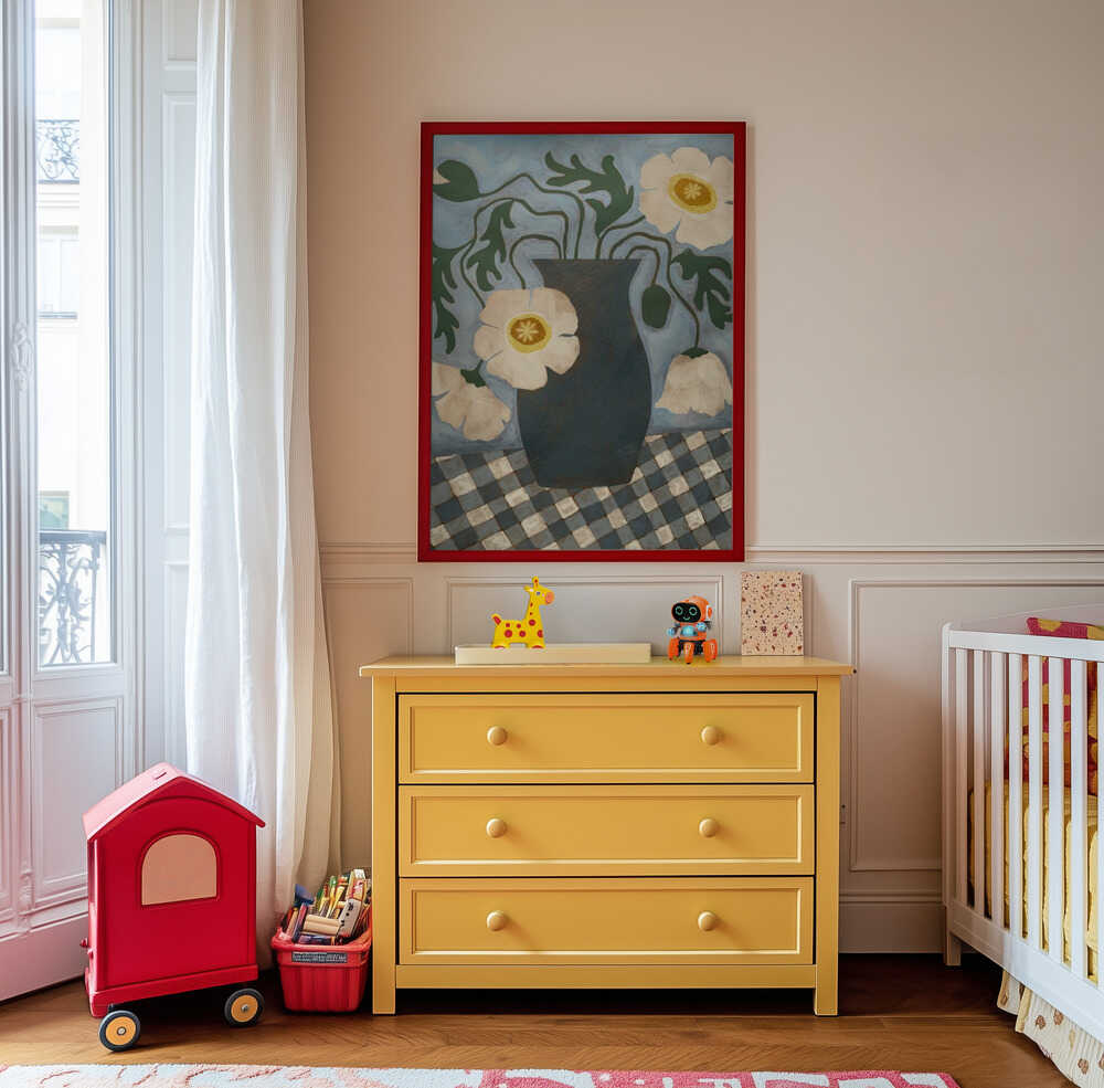 Tilføj et strejf af vintagecharme til din indretning med denne udtryksfulde vægkunst, der viser en dyb blå vase fyldt med bløde hvide blomster mod en afdæmpet blå baggrund og et ternet dækkeservietmønster. Det minimalistiske design og den afbalancerede farvepalet skaber en rolig atmosfære uden at dominere rummet. Designet til at føles både tidløst og legende passer det perfekt over tremmesengen, læsehjørnet eller skrivebordet. Et smukt valg til børneværelset, legerummet eller den moderne familiebolig – og passer naturligt sammen med skandinavisk indretning og gallerivægge. Trykt på mat museumskvalitetspapir, der bevarer alle fine detaljer og farver i mange år.